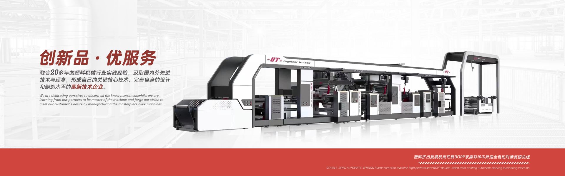 優(yōu)特機(jī)械精心致力于塑料編織行業(yè)、紙塑軟包裝行業(yè)、輪胎制造行業(yè)等成套生產(chǎn)設(shè)備的設(shè)計(jì)和制造,并為用戶(hù)提供生產(chǎn)工藝及培訓(xùn)。我們的服務(wù)范圍包括各類(lèi)塑料覆膜機(jī)、紙張覆膜機(jī)、BOPP彩印膜雙面自動(dòng)對(duì)版覆膜機(jī)、 紙塑邊縫三合一覆膜機(jī)、中縫印刷制袋機(jī)、以及輪胎行業(yè)循環(huán)回收使用的隔離膜生產(chǎn)線(xiàn)。